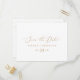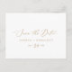 This delicate gold horizontal save the date postcard is perfect for a modern wedding. The romantic minimalist design features lovely and elegant champagne golden yellow typography on a white background with a clean and simple look.