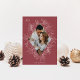 A modern and elegant holiday card that frames your vertical or portrait orientated photo in a beautifully detailed diamond shaped frame with holly leaves, berries, and winter leaves on a soft cranberry red background. "JOY" appears at the top left, with your family name along the bottom. The year is tucked elegantly into the finely detailed white botanical frame. A delicate and refined nature inspired choice for your Christmas 2021 cards.