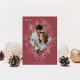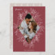 A modern and elegant holiday card that frames your vertical or portrait orientated photo in a beautifully detailed diamond shaped frame with holly leaves, berries, and winter leaves on a soft cranberry red background. "PEACE" appears at the top left, with your family name along the bottom. The year is tucked elegantly into the finely detailed white botanical frame. A delicate and refined nature inspired choice for your Christmas 2021 cards.