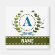 A delicate ivy wreath with a blue striped bow is layered over a fresh white background. Wedding appropriate design features the monogram "A" in blue. Magnet can be personalised with any name over the green ribbon banner. Design tip: For the font shown here, use all caps for the name.