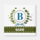 A delicate ivy wreath with a blue striped bow is layered over a fresh white background. Wedding appropriate design features the monogram "B" in blue. Magnet can be personalised with any name over the green ribbon banner. Design tip: For the font shown here, use all caps for the name.