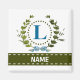 A delicate ivy wreath with a blue striped bow is layered over a fresh white background. Wedding appropriate design features the monogram "L" in blue. Magnet can be personalised with any name over the green ribbon banner. Design tip: For the font shown here, use all caps for the name.