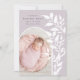 Chic and modern birth announcement features a single vertical/portrait orientated photo in an arched layout, with climbing vines of white botanical leaves along the right side. Personalise with your baby's name, birth date, and stats, and add a personal message to the back, along with an additional photo.