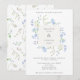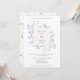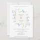 An elegant wedding invitation featuring a center square frame surrounded by delicate light blue flowers and greenery. On the reverse of the invite, is a pattern of watercolor blue flowers and greenery.