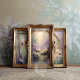 Step into an enchanted garden where hummingbirds hover among purple cosmos and glowing wildflowers, and a soft golden light beckons from the far end of a winding path. This luminous panel from the Delicate Moments collection is framed in an ornate gold rectangular border with intricate scrollwork, giving the impression of peering into a secret, sunlit world.