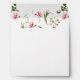 This custom square envelope has delicate watercolor spring blossoms on the inside lining of the envelope. Colours include shades of pink from pastel to vibrant deep pink along with beige florals and wispy greenery. A text template is included on the back flap for personalising with your name and return address.