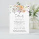 Elegant spring floral wedding details card featuring a top border of watercolor flowers and foliage in shades of peach, ivory, orange, blush pink, purple, yellow, and green. "Details" is displayed in a modern calligraphy script. Personalise the watercolor floral details card with your wedding details (hotel accommodations, directions, wedding website, etc.). The design coordinates with our Delicate Spring Floral wedding collection.