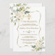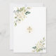Elegant card design featuring watercolour delicate white flowers and green leaves, a faux gold shining cross and frame, floral divider, on a white background. On the back white flowers bouquets and gold cross. Use Personalise tool to add your info, change fonts, font's colours. For matching items, please, visit my Confirmation Collection.
