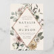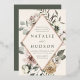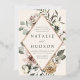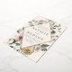 Elegant winter floral wedding invitations featuring your wedding details displayed in dark green lettering nestled inside of a boho floral and rose gold foil frame with an ivory background. The winter flowers feature a colour palette of dusty rose, light pink, ivory, and soft golden yellow with eucalyptus leaves and winter foliage in shades of sage green and rich forest green.