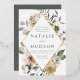 Elegant winter floral wedding invitations featuring your wedding details displayed in dark green lettering nestled inside of a boho floral and gold foil frame. The winter flowers feature a colour palette of dusty rose, light pink, ivory, and soft golden yellow with eucalyptus leaves and winter foliage in shades of sage green and rich forest green.