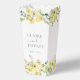 Delicate watercolor yellow flowers decorate this lovely summer afternoon wedding popcorn favor box. The garden wedding box is accented with a gentle sage green rectangle border and botanical leaves underneath the elegant sunny peonies. Floral and light, perfect for an outdoor ceremony.