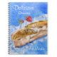 This blue watercolor binder is of a crusty french baguette and two strawberries against a textured background of blues. Text in white reads "Delicious Dreams and Magic" in two fonts, Change ANY OF the text or font to create your personalised gift photo binder. If you need help customising, contact lilly@lillyarts.com