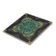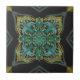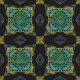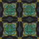 Black background with an exquisite pattern of grey, yellow, green and light blue. A unique and original hand drawn design by Mary.