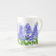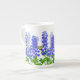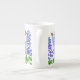 Original fine art design of Delphinium or Larkspur flowers and butterflies by artist Carolyn McFann of Two Purring Cats Studio printed on a quality bone china mug for garden flower fans.