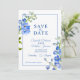 Beautiful delphinium spikes painted blue botanical art and photo on reverse wedding save the date invitation. Edit this save the date wedding card with your own words and special photo. Unique design and original hand painted pan watercolor fine flower art by Sarah Trett exclusively for www.mylittleedenweddings.com on Zazzle.