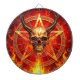 This captivating piece of artwork features a menacing evil demon skull, complete with intricate horns. The skull is prominently placed in front of a fiery pentagram, with flames rising dramatically in the background.