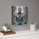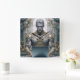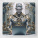 Mystical warrior with horns and ornate gold armor working intently on a laptop in a baroque setting. Powerful motif for fantasy fans, gamers, and tech enthusiasts with a sense of epic aesthetics.