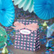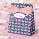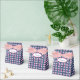 This adorable favour box has a denim looking background with a pattern of pink and white tie dyed hearts. On the front flap there is a white oval with a coordinating pink border. To finish the design there's a pink bow. Bows come in four colours. Text inside the oval can be customised.