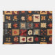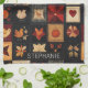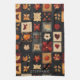 This kitchen towel features a denim-textured folk art quilt pattern, blending autumn and country-style charm. The patchwork is composed of square blocks stitched together, each showcasing a distinct motif such as pumpkins, fall leaves (oak and maple), birds, sunflowers, hearts, and stars, all in a rustic primitive Americana style. The warm palette of oranges, reds, and browns contrasts beautifully with dark blue and black backgrounds, adding depth and a cosy, handmade feel. Perfect for farmhouse décor, autumn crafts, Thanksgiving projects, rustic textiles, and country-inspired DIY designs.