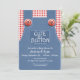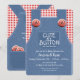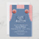 Cute as a button baby shower invitation in gender neutral red and blue denim overalls with red gingham shirt and a lollipop in the back pocket, baby shower invitation. Perfect for farm themes or rustic country baby showers.