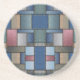 A symmetrical arrangement of textured, fabric-like rectangles in muted tones of blue, green, pink, and beige. The layout resembles a patchwork quilt or mosaic, with each block meticulously aligned to create a balanced, grid-like structure.