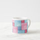 A pretty, espresso mug, with a patchwork of pink and blue denim pattern, from a handpainted watercolour design by Judy Adamson.