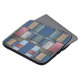 A symmetrical arrangement of textured, fabric-like rectangles in muted tones of blue, green, pink, and beige. The layout resembles a patchwork quilt or mosaic, with each block meticulously aligned to create a balanced, grid-like structure.