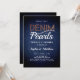A modern, elegant and chic, denim and pearls couple's shower invitation with a denim and diamonds and pearls theme. It features a denim background, a string of pearls (these are digital effects, not real stones or pearls!) custom letters for the word "denim", with a brass effect, and typography in white. A chic "denim and pearls" wedding shower invitation for a modern couple who loves denim.