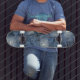 Denim Skateboard - comfy and broken in just like your favourite pair of jeans. A patchwork design of blue jean pockets, rips, holes and fades.