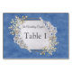 Denim texture backgrounds decorated with white-cream lace and some with light bronze jewel designs and ivory pearls to personalise number and name cards for each quest on the table.