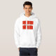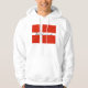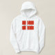 The national flag of Denmark, Dannebrog, is red with a white Scandinavian cross that extends to the edges of the flag.