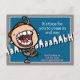 A colourful and charming dental appointment reminder card featuring a super unique hand drawn boy sitting in a dentist chair with his large mouth open. Done in bright, vibrant colours. Every element of this card is fully customisable.