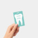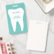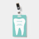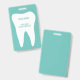 Dental practice name badges with white molar tooth logo. Professional dentistry clinic and dental practice supplies. Personalise with (company) name. White and teal blue or custom colours. Include a handy clip or cord line.