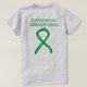 Depression awareness uses a green ribbon for its cause awareness. The shirt art features a green awareness ribbon art painting. The awareness t-shirt message notes "Depression Awareness". There is a large image on the back of the shirt and a smaller picture on the front of the shirt.