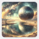 A massive metallic sphere hovers over a reflective, barren landscape, creating an eerie yet mesmerising scene. The sky is filled with vibrant, swirling clouds, casting dramatic reflections in the water below.