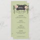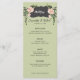 This desert bloom menu features pink blossoms and greenery on either side of a curvy black box with the word "Menu." All the important wedding menu details can be edited. Colours include green, pink, white and black.