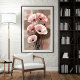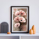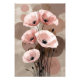 A bouquet of soft blush poppies stretches elegantly against a background of muted clay and taupe tones. The petals, rendered with fine ink-like lines, contrast beautifully with the abstract, watercolor-inspired backdrop. The black seed pods and curling stems add a graceful sense of motion, almost like the flowers are swaying gently in a warm breeze.
