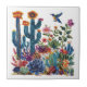 Welcome to the artistry of 'Desert Blooms: Blossom Oasis,' one of six captivating ceramic tile designs from our cherished collection. Each tile is an artisanal portrayal of the desert's vibrant ecosystem, with a lush ensemble of cacti, blossoms, and fauna rendered in a kaleidoscope of rich, tactile colours. The 'Blossom Oasis' tile, with its intricate embroidery-style artwork, encapsulates the rhythmic beauty of desert life. These ceramic tiles are meticulously crafted to stand the test of time, allowing you to bring the enduring allure of the desert into your living space. Whether displayed individually to accentuate a singular point of beauty or grouped to create an expansive mural, each design within the collection complements the others, yet shines with its own unique spirit. Use as a statement backsplash, a decorative wall accent, or a standalone display piece. Together or apart, the 'Desert Blooms' tiles offer a flexible approach to decor, inviting you to curate a space that resonates with the harmonious and wild symphony of the desert. Art and design © 1201AM Creative