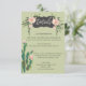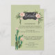 This cactus garden details card features a prickly pear cactus with pink blossoms. All the important wedding details can be edited. Colours include green, pink, white and black.