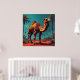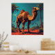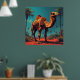 A solitary camel poses in a desert setting, framed by tall palm trees and a vivid blue sky. Warm sunlight highlights textured fur and rugged landscape for travel or wildlife use.