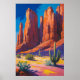 A striking desert landscape showcasing towering red rock formations and sunlit cactus scenery, painted in bold and warm tones.