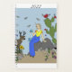 A girl in jeans, done in a cartoon style, sitting on a rock surrounded by local SW flora and fauna. The critters include Calliope and Black-chinned hummingbirds, a rabbit, a mouse, a pet dog, several chubby birds, blooming cactus, a deer, some eyelash-grass plants, a couple of butterflies, prickly poppy flowers, and some prairie sunflowers.