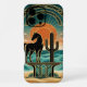 A bold black horse silhouette stands tall beside a towering cactus, framed by a glowing orange sunset, flowing teal waves, and an ornate Art Deco golden arch. Inspired by vintage retro travel poster art and 1930s southwest design, this case blends wild western spirit with geometric elegance and vivid warm colors. The desert horse silhouette iPhone 16 Pro Max case is a perfect gift for horse lovers, western art fans, boho desert enthusiasts, and admirers of bold retro illustration. Slim tough case, wireless charging compatible, full wrap-around protection with a timeless desert scene.