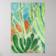 A contemporary graphic depiction of a desert landscape, painted in loose watercolor. Cool shades of greens fill the page as a warm brown mountain peeks through whimsical cactus. A great way to bring a little nature to any room!