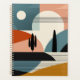 An abstract landscape of a desert scene with lines and shapes in shades of brown, orange, turquoise, beige, tan, and black.