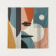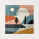 An abstract landscape of a desert scene with lines and shapes in shades of brown, orange, turquoise, beige, tan, and black.