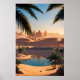 The picture depicts a serene desert landscape with a vibrant blue oasis in the foreground. Palm trees frame the landscape, their lush green foliage contrasts with the warm sand dunes. The sky is soft blue, which indicates a peaceful and calm atmosphere. In the distance, a cluster of rock formations rises, adding a sense of mystery and grandeur to the landscape.