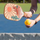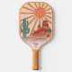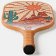 Play in style with this cool pickleball paddle featuring a retro vintage desert landscape design with a "pickleball sun", cactus, mesa mountains and flowers. Add 3 lines of custom text - name, monogram, pickleball club name, company name, location, phone number, etc. A perfect gift adults, kids, moms, dads, or anyone who plays pickleball near the desert.