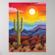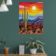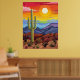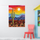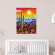 This vibrant desert landscape artwork a majestic saguaro cactus against a dramatic rainbow sunset sky. This modern southwestern wall art captures the beauty of Arizona desert scenery with purple mountains, desert flora and a golden sun, perfect for home decor, office spaces or as a unique gift for desert nature lovers.