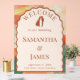 Warm terracotta hues and an arched layout make this welcome sign perfect for rustic desert or boho weddings. A bold, earthy style your guests will love.